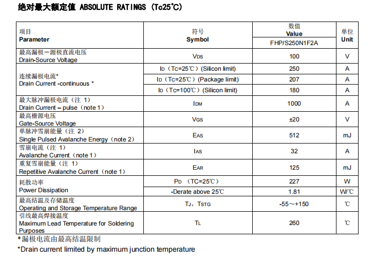 當然,MPPT控制器MOS管,FHP250N1F2A在應用中,我們逆變器研發(fā)工程師一定要了解這款優(yōu)質(zhì)FHP250N1F2A國產(chǎn)場效應管的詳細參數(shù):其具有250A、100V的電流、電壓, RDS(on) = 3.0mΩ(MAX) @VGS = 10 V,RDS(on) = 2.5mΩ(TYP) @VGS = 10 V,最高柵源電壓@VGS =±20 V。