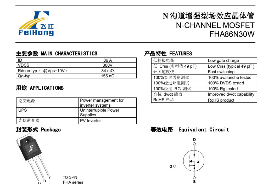 綜合以上的產(chǎn)品參數(shù),全橋逆變電路MOS管,代換IXFH86N30T3000W戶外儲(chǔ)能電源逆變模塊的全橋逆變電路除選用IXFH86N30T場(chǎng)效應(yīng)管外,還可以用飛虹半導(dǎo)體的國(guó)產(chǎn)型號(hào):FHA86N30W型號(hào)參數(shù)來(lái)代換。