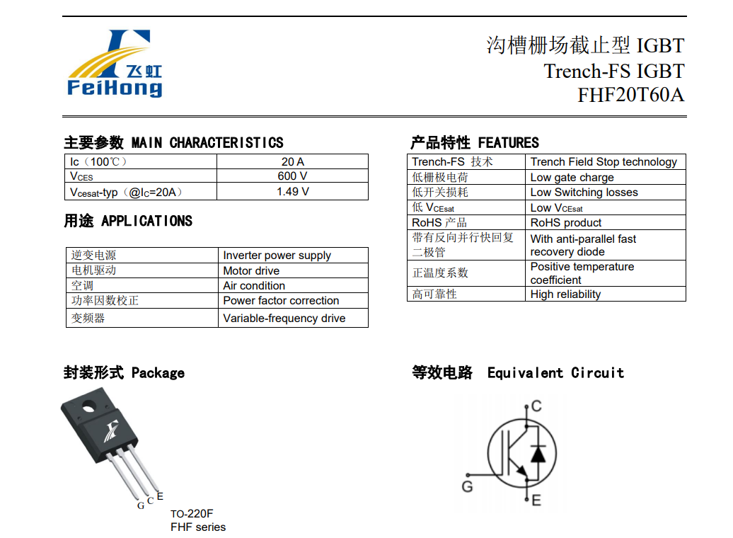 2、FHF20T60A的封裝形式是TO-220F,其具有20A, 600V, VCEsat典型值:1.49V,<1.70V;IC (Tc=100℃):20A;Bvces:600V;IF (Tc=25℃):40A;IF (Tc=100℃):20A。